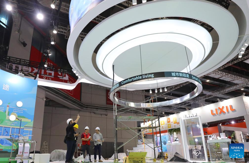Exhibitors make preparations at the National Exhibition and Convention Center (Shanghai), the main venue for the 7th China International Import Expo (CIIE), in east China's Shanghai, Nov. 2, 2024. Preparations for the 7th CIIE, which is scheduled to take place in Shanghai from Nov. 5 to 10, have entered the final stage. (Xinhua/Fang Zhe)
