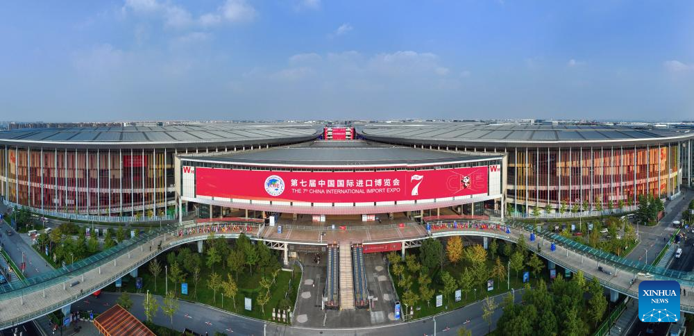 A panoramic drone photo taken on Nov. 2, 2024 shows the west entrance of the National Exhibition and Convention Center (Shanghai), the main venue for the 7th China International Import Expo (CIIE), in east China's Shanghai. The center has been fully decorated to welcome the upcoming 7th CIIE, which is scheduled to take place in Shanghai from Nov. 5 to Nov. 10. (Xinhua/Liu Ying)