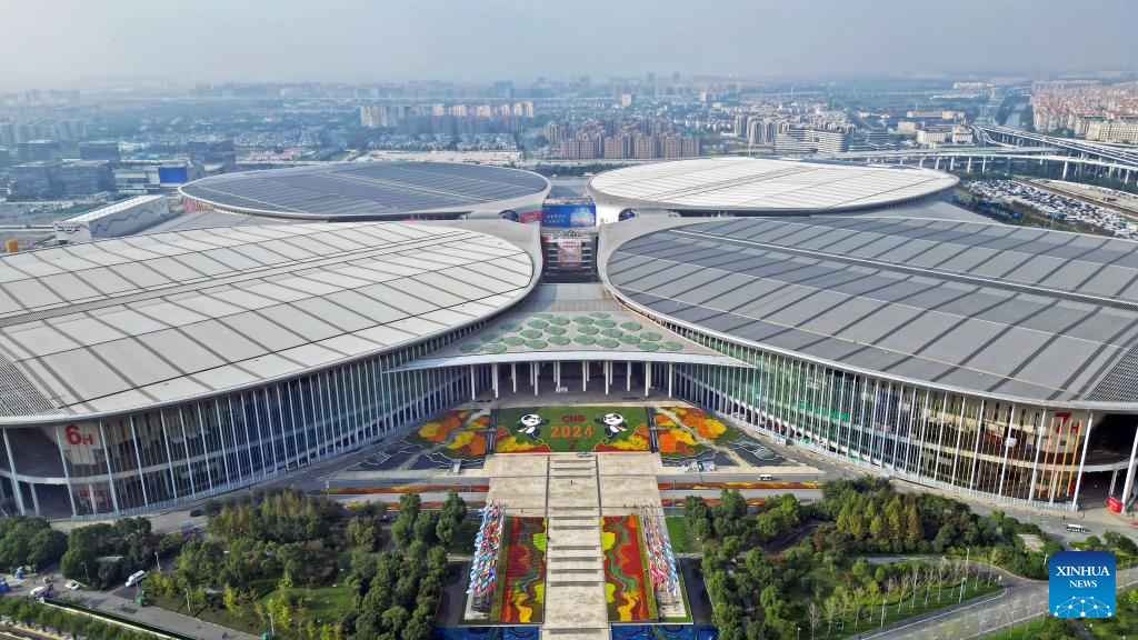 This photo taken on Nov. 2, 2024 shows the south square of the National Exhibition and Convention Center (Shanghai), the main venue for the 7th China International Import Expo (CIIE), in east China's Shanghai. The center has been fully decorated to welcome the upcoming 7th CIIE, which is scheduled to take place in Shanghai from Nov. 5 to Nov. 10. (Xinhua/Liu Ying)