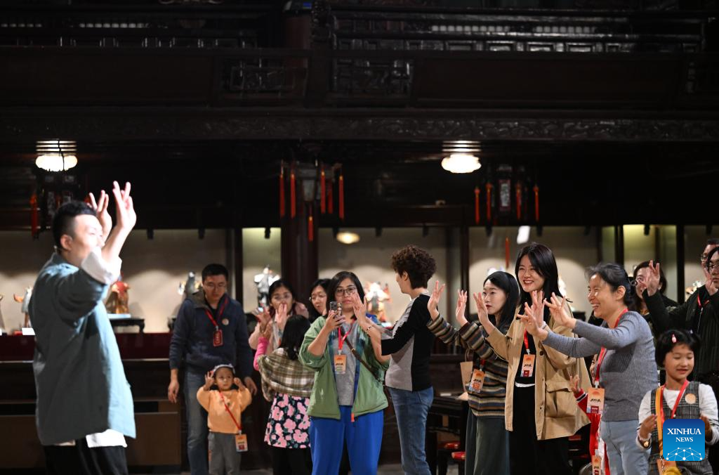 Members of the audience learn Chinese opera movements from an actor (1st L) at Guangdong Guild Hall in Nankai District, north China's Tianjin, Nov. 2, 2024. Guangdong Guild Hall, a century-old complex now serves as an opera museum in Tianjin, has recently introduced an interactive opera show. Since its debut, the show has provided its audience with an immersive experience of traditional Chinese opera art through multiple forms of interactions. (Xinhua/Zhao Zishuo)