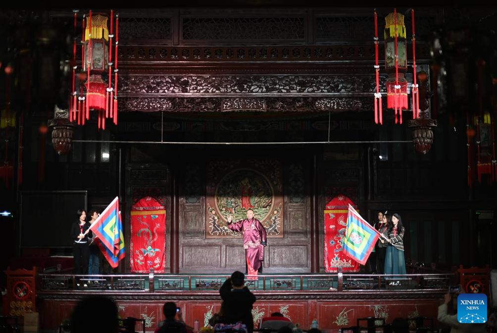 An actor (C) performs as members of the audience play the supporting roles on stage during an interactive opera show at Guangdong Guild Hall in Nankai District, north China's Tianjin, Nov. 2, 2024. Guangdong Guild Hall, a century-old complex now serves as an opera museum in Tianjin, has recently introduced an interactive opera show. Since its debut, the show has provided its audience with an immersive experience of traditional Chinese opera art through multiple forms of interactions. (Xinhua/Zhao Zishuo)