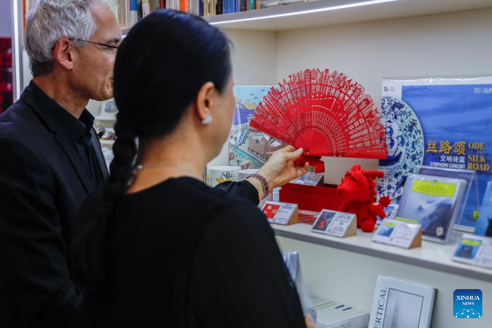 Artists watch cultural and creative products after their performance at the media center of the 7th China International Import Expo (CIIE) in Shanghai, east China, Nov. 4, 2024. The 7th CIIE will be held in Shanghai from Nov. 5 to 10. A variety of cultural activities at the media center attracted many media staff. (Photo by Chang Nengjia/Xinhua)