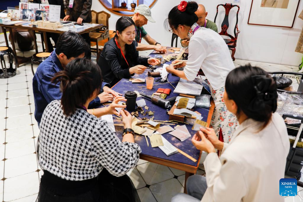 Media workers try lacquerware making at the media center of the 7th China International Import Expo (CIIE) in Shanghai, east China, Nov. 4, 2024. The 7th CIIE will be held in Shanghai from Nov. 5 to 10. A variety of cultural activities at the media center attracted many media staff. (Photo by Chang Nengjia/Xinhua)