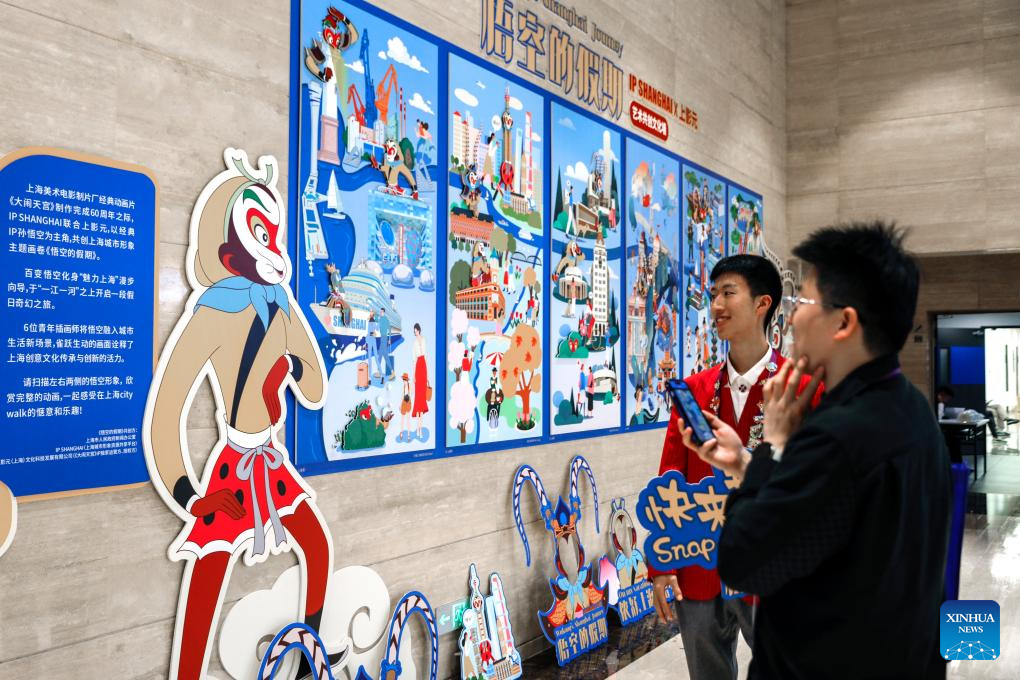 Media workers look at "Wukong's Shanghai Journey," a comic themed on Shanghai, at the media center of the 7th China International Import Expo (CIIE) in Shanghai, east China, Nov. 4, 2024. The 7th CIIE will be held in Shanghai from Nov. 5 to 10. A variety of cultural activities at the media center attracted many media staff. (Photo by Chang Nengjia/Xinhua)