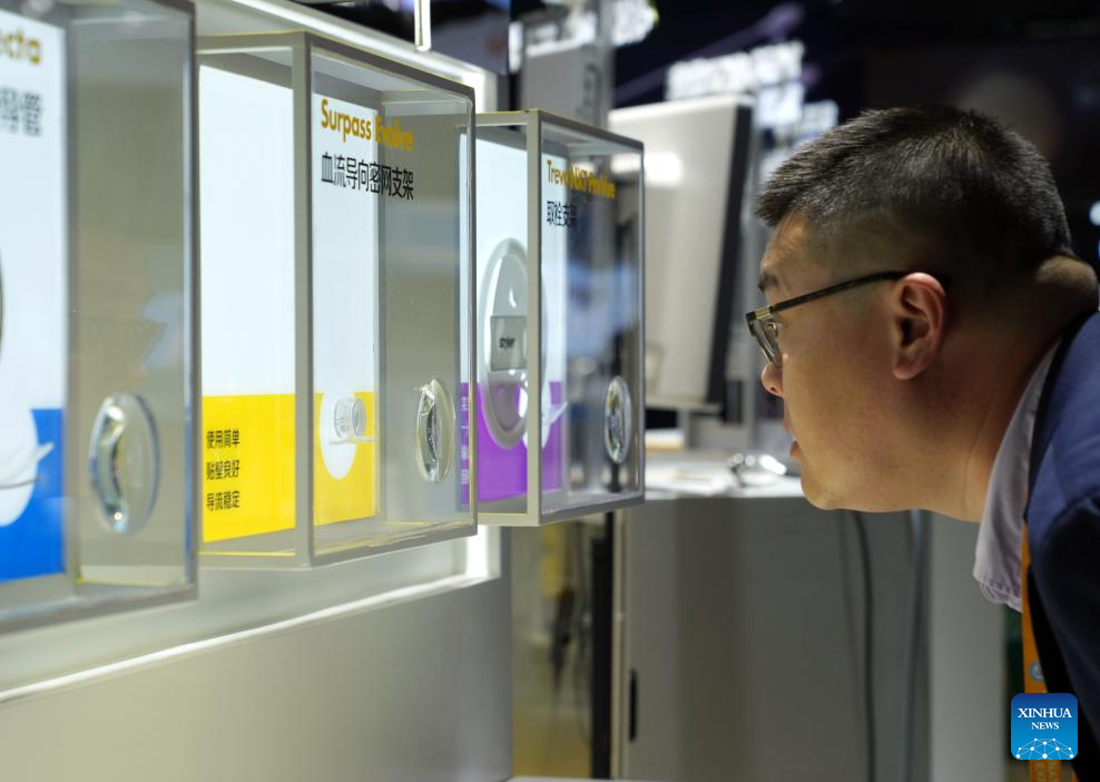 A visitor looks at vascular stent products during the seventh China International Import Expo (CIIE) in east China's Shanghai, Nov. 5, 2024. The newest edition of the CIIE, the world's first national-level exposition dedicated to imports, opened on Tuesday in Shanghai. (Xinhua/Liu Ying)