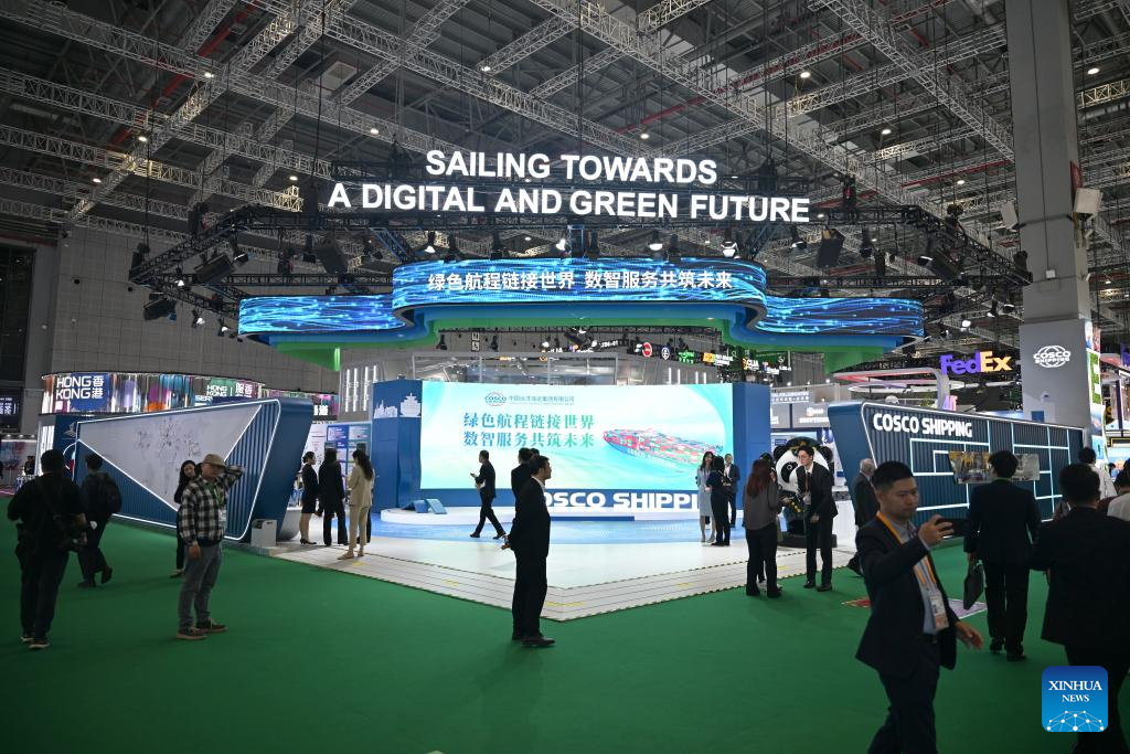 This photo taken on Nov. 5, 2024 shows the exhibition area of COSCO Shipping during the seventh China International Import Expo (CIIE) in east China's Shanghai. The newest edition of the CIIE, the world's first national-level exposition dedicated to imports, opened on Tuesday in Shanghai. (Photo by Chen Haoming/Xinhua)