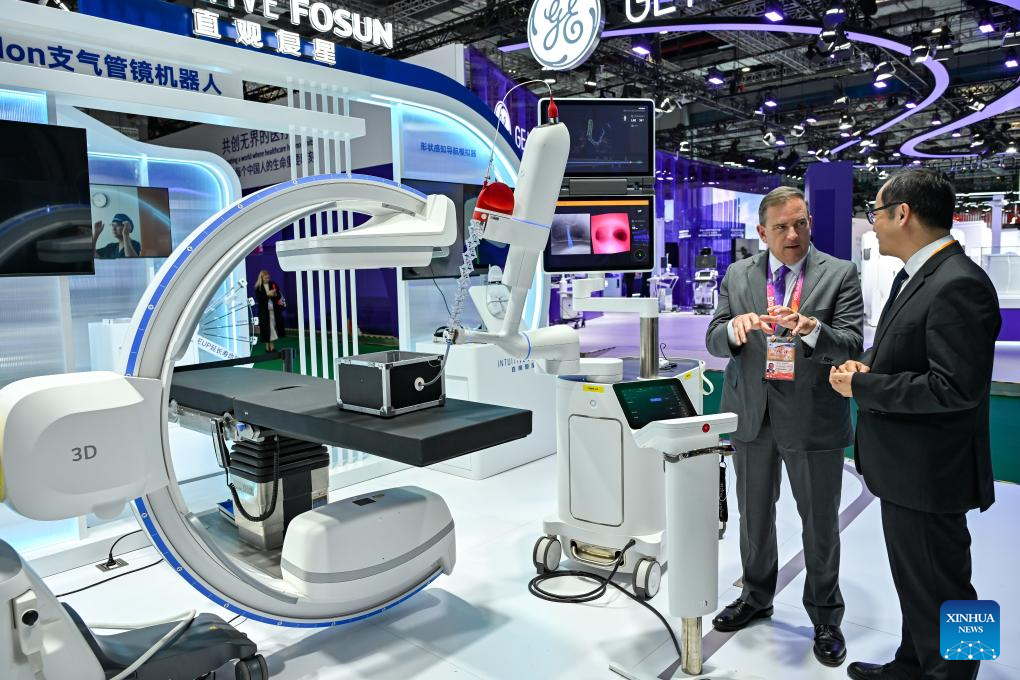 A visitor learns about a bronchoscope robot at the exhibition area of Intuitive Fosun during the seventh China International Import Expo (CIIE) in east China's Shanghai, Nov. 5, 2024. The newest edition of the CIIE, the world's first national-level exposition dedicated to imports, opened on Tuesday in Shanghai. (Xinhua/Zhang Cheng)