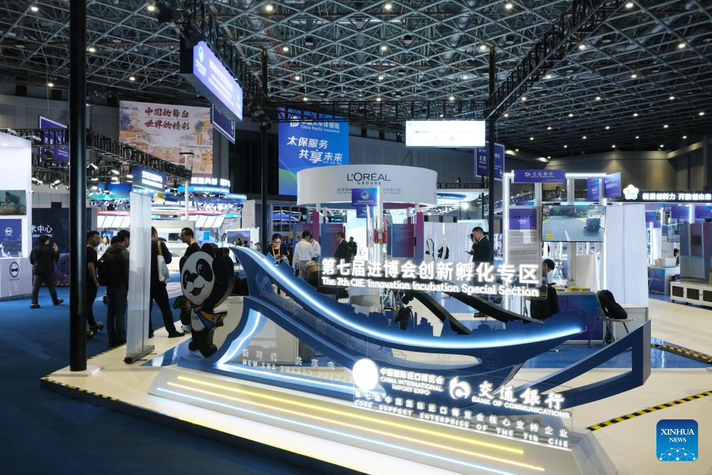 People visit the Innovation Incubation Special Section during the seventh China International Import Expo (CIIE) in east China's Shanghai, Nov. 5, 2024. The newest edition of the CIIE, the world's first national-level exposition dedicated to imports, opened on Tuesday in Shanghai. (Photo by Zhou Xinyi/Xinhua)