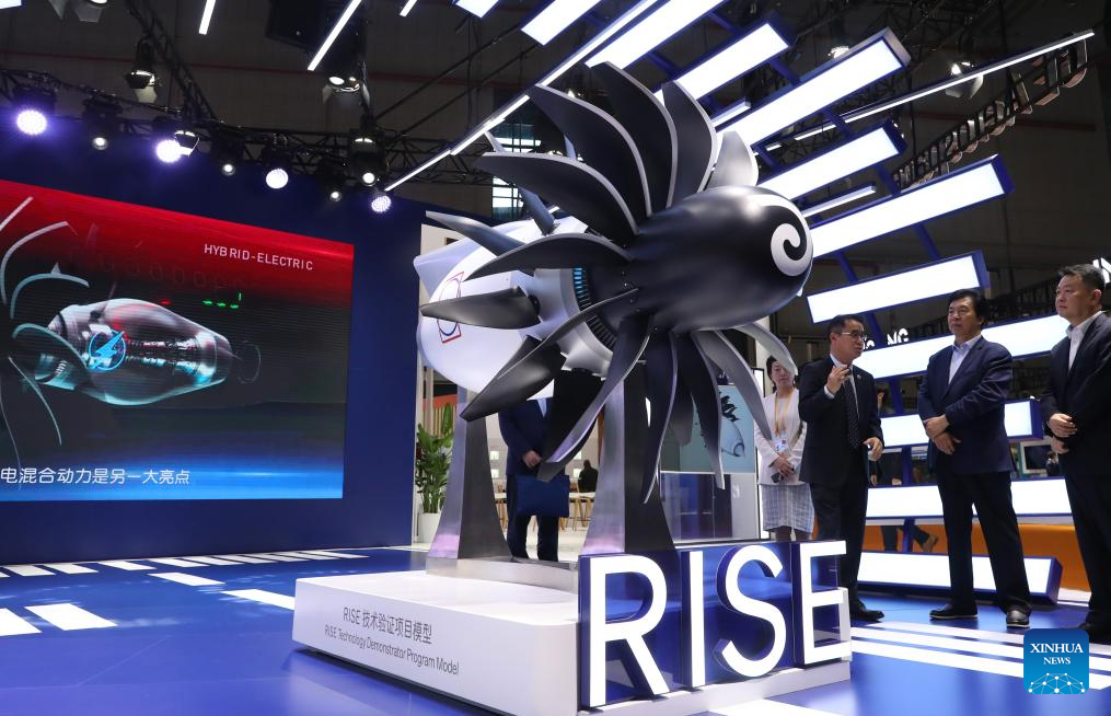 Visitors look at the RISE technology demonstrator program model at the exhibition area of General Electric during the seventh China International Import Expo (CIIE) in east China's Shanghai, Nov. 5, 2024. The newest edition of the CIIE, the world's first national-level exposition dedicated to imports, opened on Tuesday in Shanghai. (Xinhua/Fang Zhe)