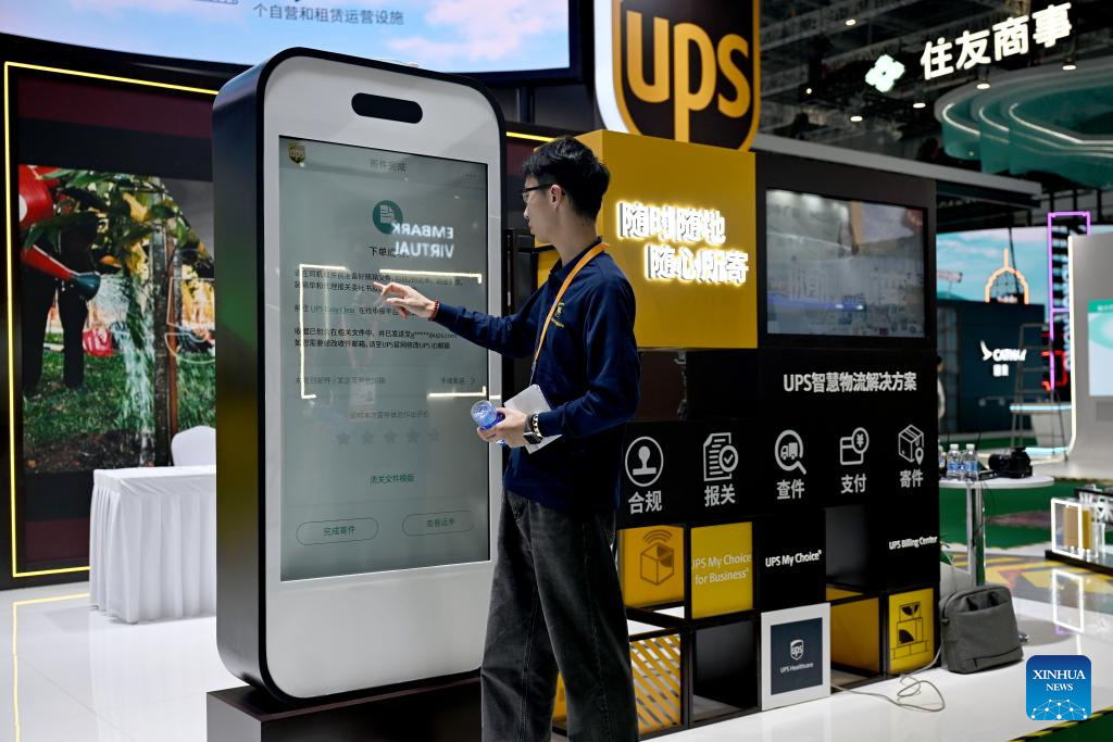 A staff member shows smart logistics solutions at the booth of UPS during the seventh China International Import Expo (CIIE) in east China's Shanghai, Nov. 5, 2024. The newest edition of the CIIE, the world's first national-level exposition dedicated to imports, opened on Tuesday in Shanghai. (Photo by Chen Haoming/Xinhua)