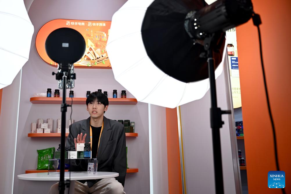 A staff member promotes products via livestreaming at the exhibition area of trade in services during the seventh China International Import Expo (CIIE) in east China's Shanghai, Nov. 5, 2024. The newest edition of the CIIE, the world's first national-level exposition dedicated to imports, opened on Tuesday in Shanghai. (Photo by Chen Haoming/Xinhua)