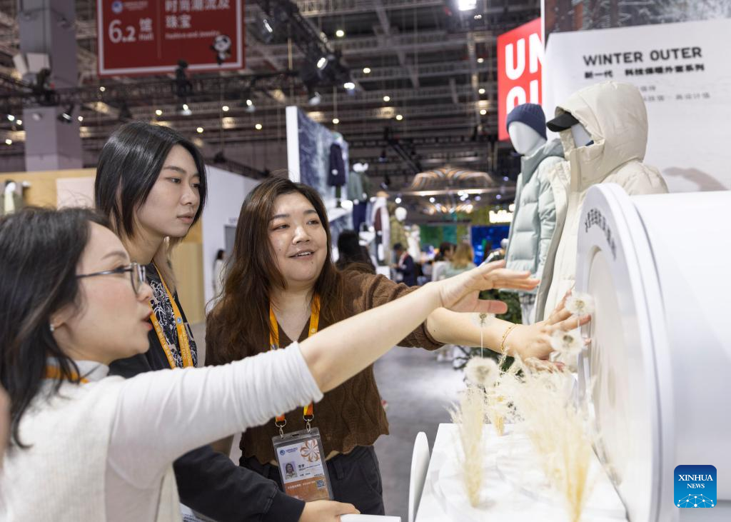 Visitors experience a windproof down feather fabric at the booth of Uniqlo during the seventh China International Import Expo (CIIE) in east China's Shanghai, Nov. 5, 2024. The newest edition of the CIIE, the world's first national-level exposition dedicated to imports, opened on Tuesday in Shanghai. (Xinhua/Wang Xiang)