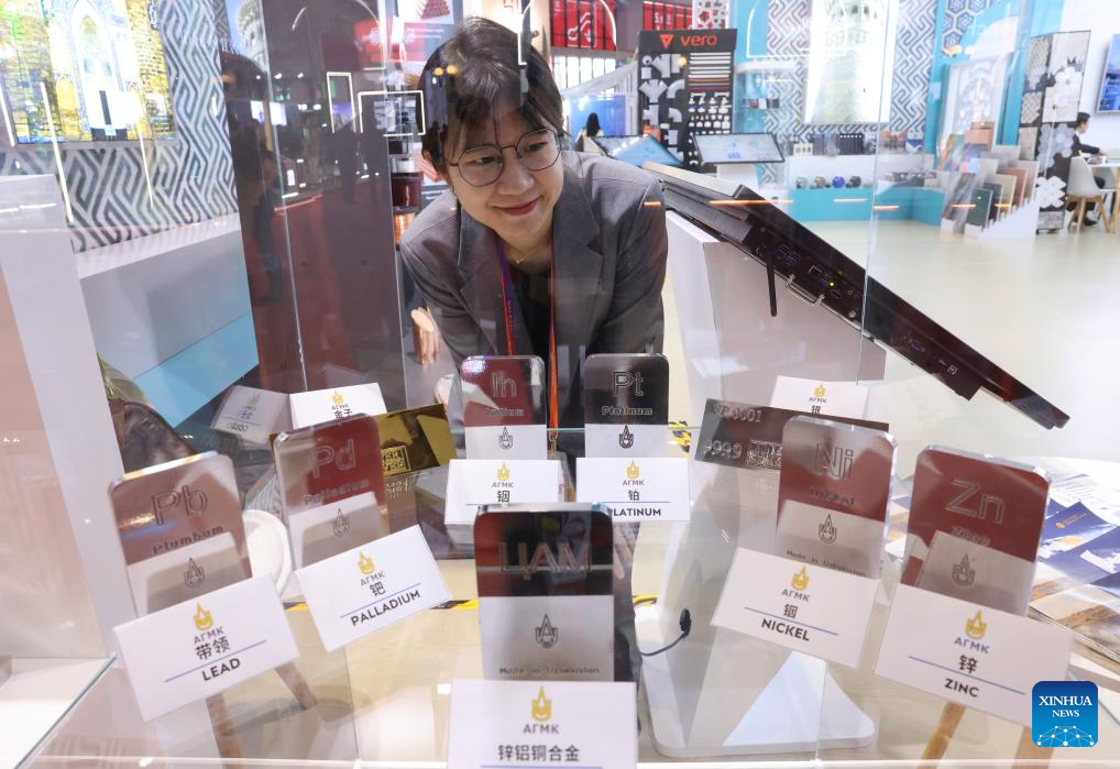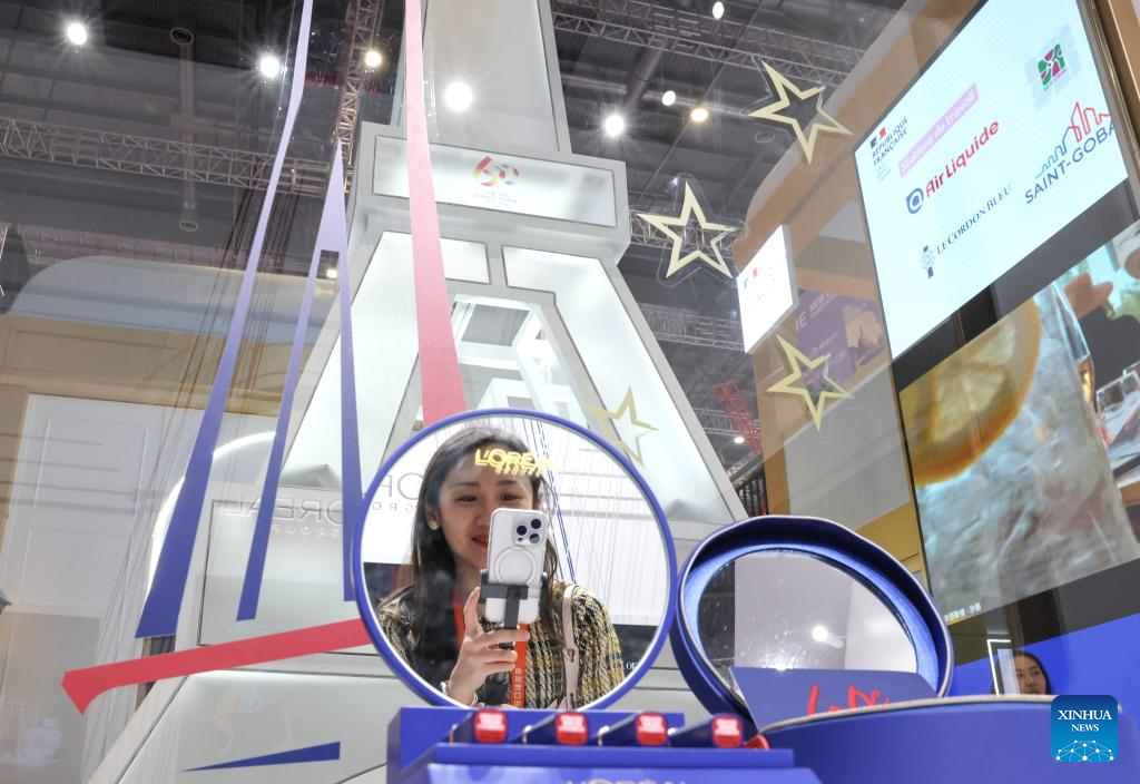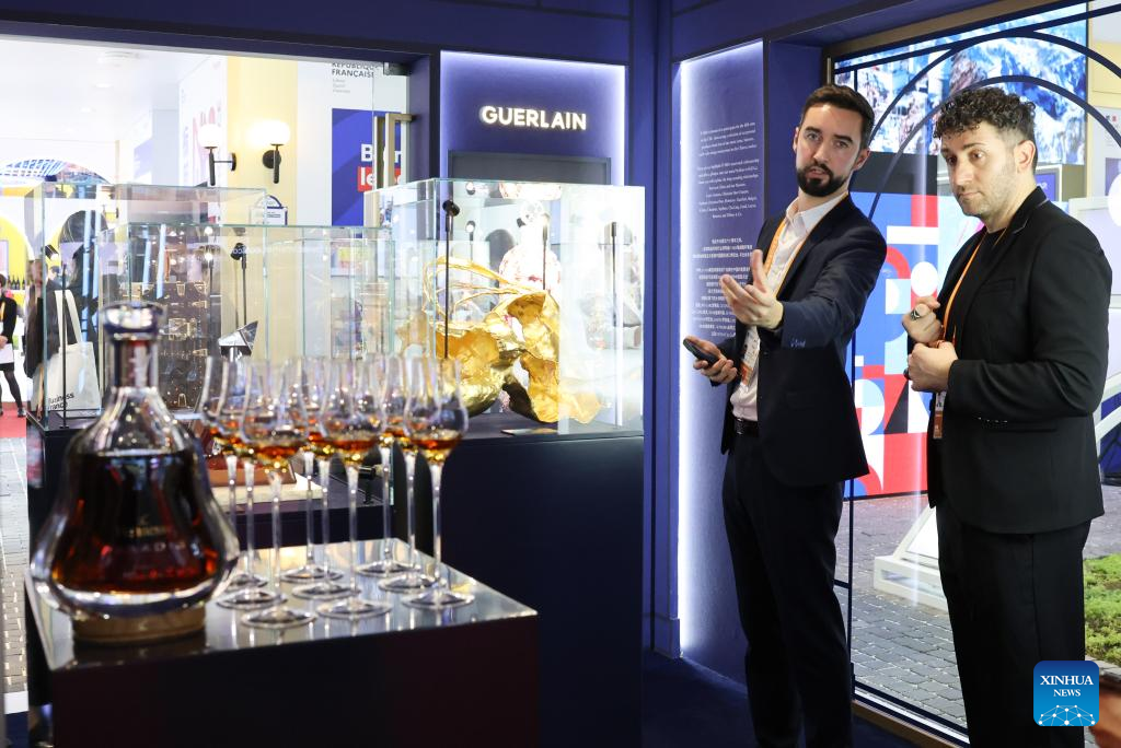 Exhibitors show exhibits at the France Pavilion during the seventh China International Import Expo (CIIE) in east China's Shanghai, Nov. 5, 2024. The newest edition of the CIIE, the world's first national-level exposition dedicated to imports, opened on Tuesday in Shanghai.