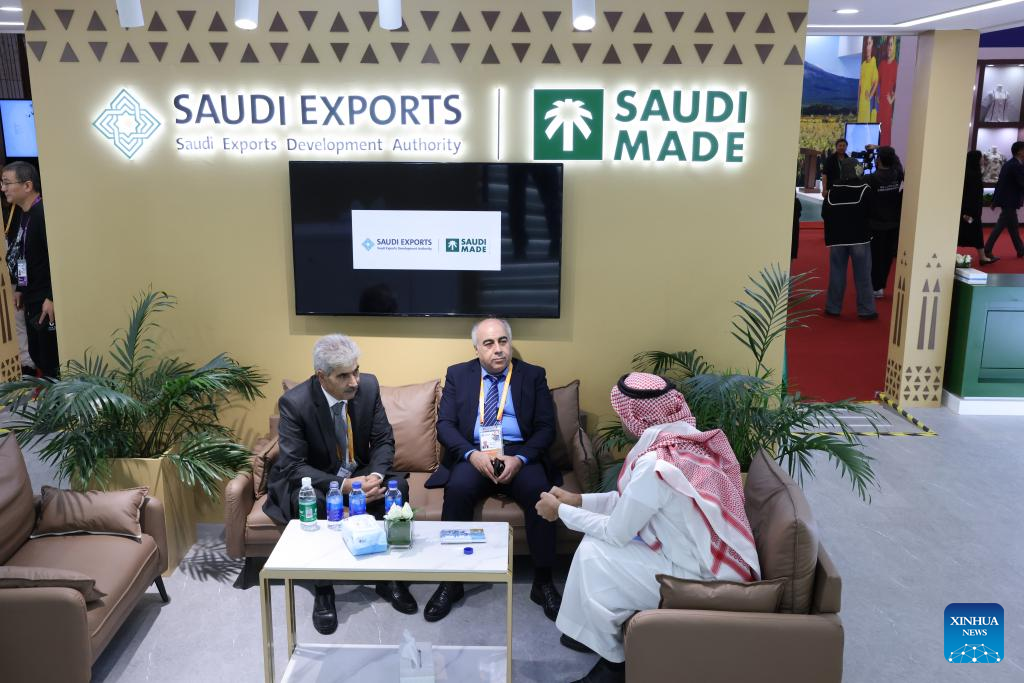 People talk at the Saudi Arabia Pavilion during the seventh China International Import Expo (CIIE) in east China's Shanghai, Nov. 5, 2024. The newest edition of the CIIE, the world's first national-level exposition dedicated to imports, opened on Tuesday in Shanghai.