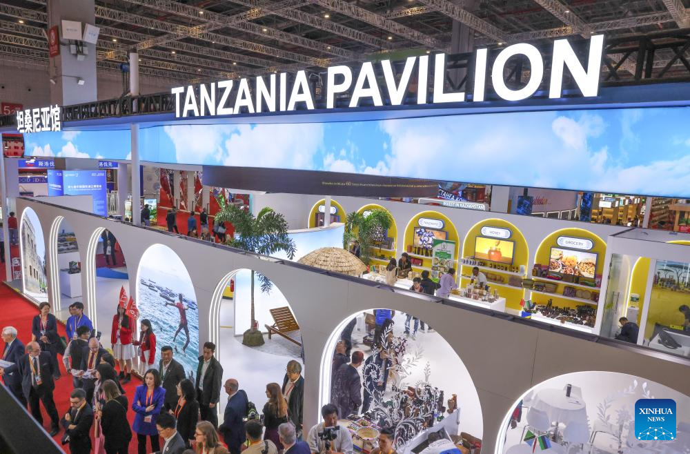 This photo taken on Nov. 5, 2024 shows the Tanzania Pavilion during the seventh China International Import Expo (CIIE) in east China's Shanghai. The newest edition of the CIIE, the world's first national-level exposition dedicated to imports, opened on Tuesday in Shanghai.