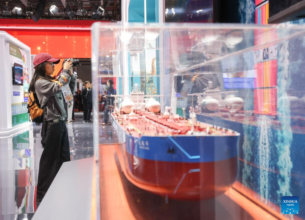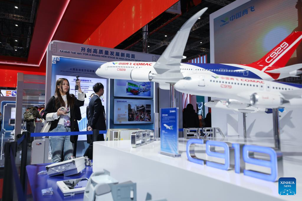 A visitor takes videos of a model of an aircraft at the booth of aircraft developer Commercial Aircraft Corporation of China, Ltd. at the China Pavilion during the seventh China International Import Expo (CIIE) in east China's Shanghai, Nov. 5, 2024. The newest edition of the CIIE, the world's first national-level exposition dedicated to imports, opened on Tuesday in Shanghai.
