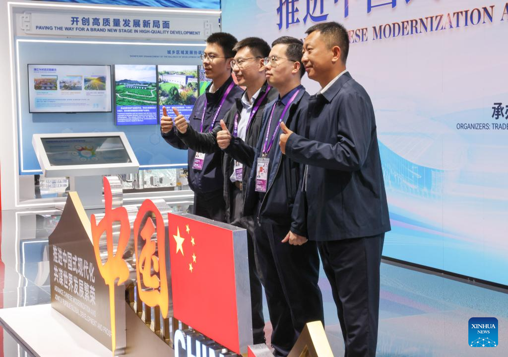 People pose for photos at the China Pavilion during the seventh China International Import Expo (CIIE) in east China's Shanghai, Nov. 5, 2024. The newest edition of the CIIE, the world's first national-level exposition dedicated to imports, opened on Tuesday in Shanghai.