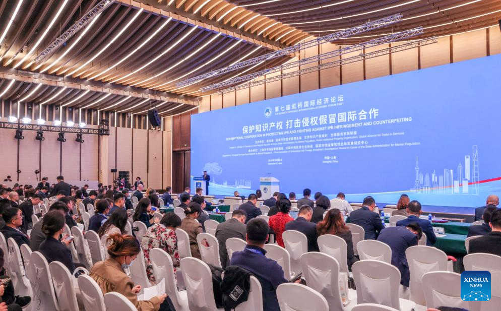 A sub-forum titled "International Cooperation in Protecting IPR and Fighting Against IPR Infringement and Counterfeiting" is held during the 7th Hongqiao International Economic Forum in Shanghai, east China, Nov. 6, 2024. (Xinhua/Yin Gang)