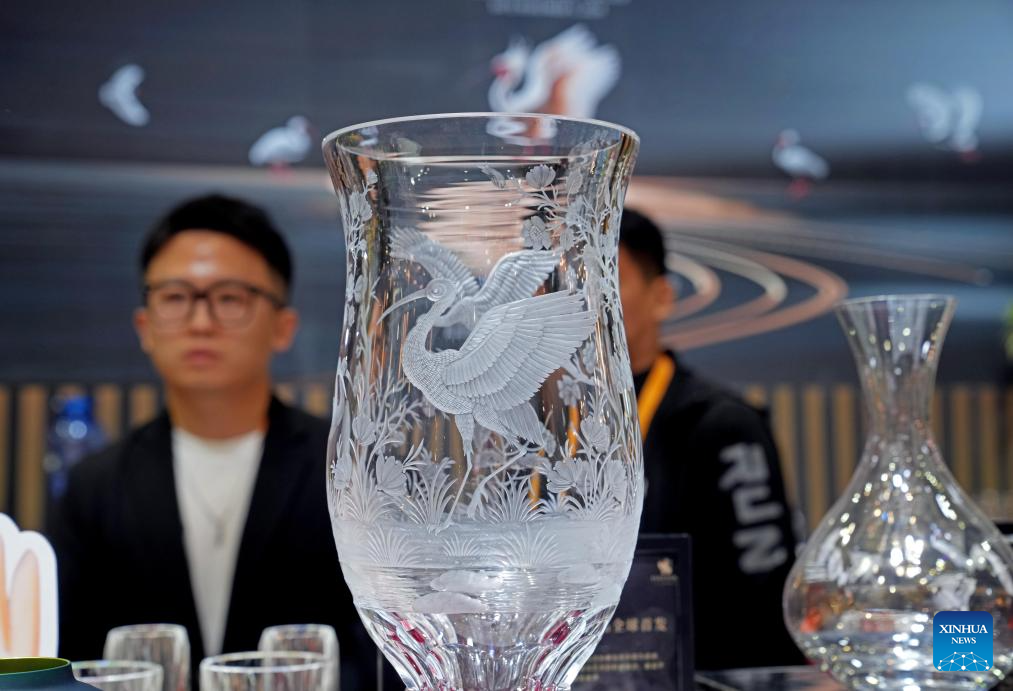A crystal product under the theme of crested ibis is pictured during the seventh China International Import Expo (CIIE) in east China's Shanghai, Nov. 6, 2024. During the ongoing 7th CIIE, many new technologies, achievements and products met the public for the first time. (Xinhua/Liu Ying)