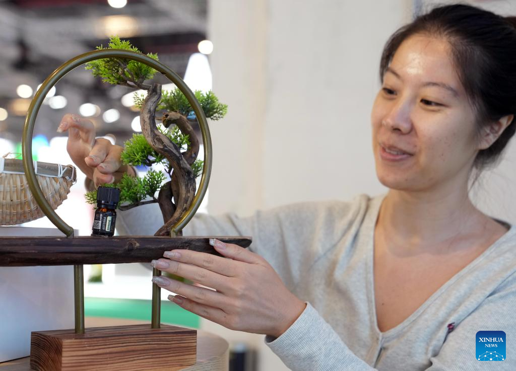 A staff member shows the ginseng aromatherapy essential oil during the seventh China International Import Expo (CIIE) in east China's Shanghai, Nov. 5, 2024. During the ongoing 7th CIIE, many new technologies, achievements and products met the public for the first time. (Xinhua/Liu Ying)
