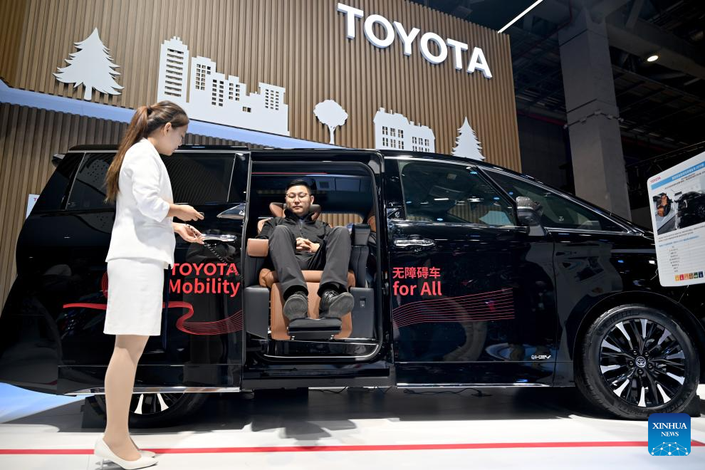 A visitor learns about a Mobility for All vehicle from Toyota during the seventh China International Import Expo (CIIE) in east China's Shanghai, Nov. 6, 2024. During the ongoing 7th CIIE, many new technologies, achievements and products met the public for the first time. (Photo by Chen Haoming/Xinhua)