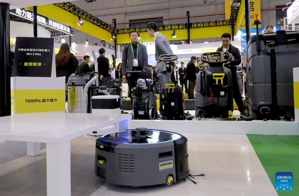 This photo taken on Nov. 6, 2024 shows cleaning robot RCV 5 Plus from Karcher during the seventh China International Import Expo (CIIE) in east China's Shanghai. During the ongoing 7th CIIE, many new technologies, achievements and products met the public for the first time. (Xinhua/Fang Zhe)