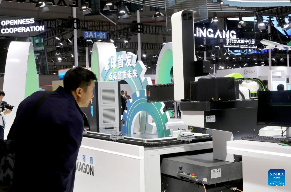 A visitor learns about the highly reflective surface defect detection solution at the booth of Hexagon during the seventh China International Import Expo (CIIE) in east China's Shanghai, Nov. 6, 2024. During the ongoing 7th CIIE, many new technologies, achievements and products met the public for the first time. (Xinhua/Fang Zhe)