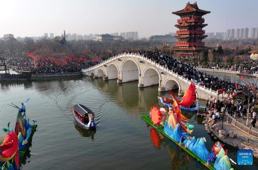 A drone photo taken on Feb. 12, 2024 shows people visiting the Millennium City Park in Kaifeng City, central China's Henan Province. During the Spring Festival holiday, various cultural tourism events across central China's Henan Province have attracted lots of tourists. (Photo by Tan Yuzeng/Xinhua)