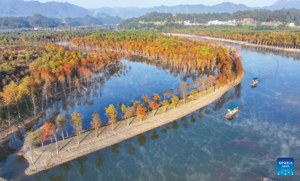 An aerial drone photo taken on Nov. 7, 2024 shows tourists viewing bald cypress forests on a sightseeing raft at a wetland park in Fangtang Township of Ningguo City, east China's Anhui Province. (Xinhua/Chen Yehua)