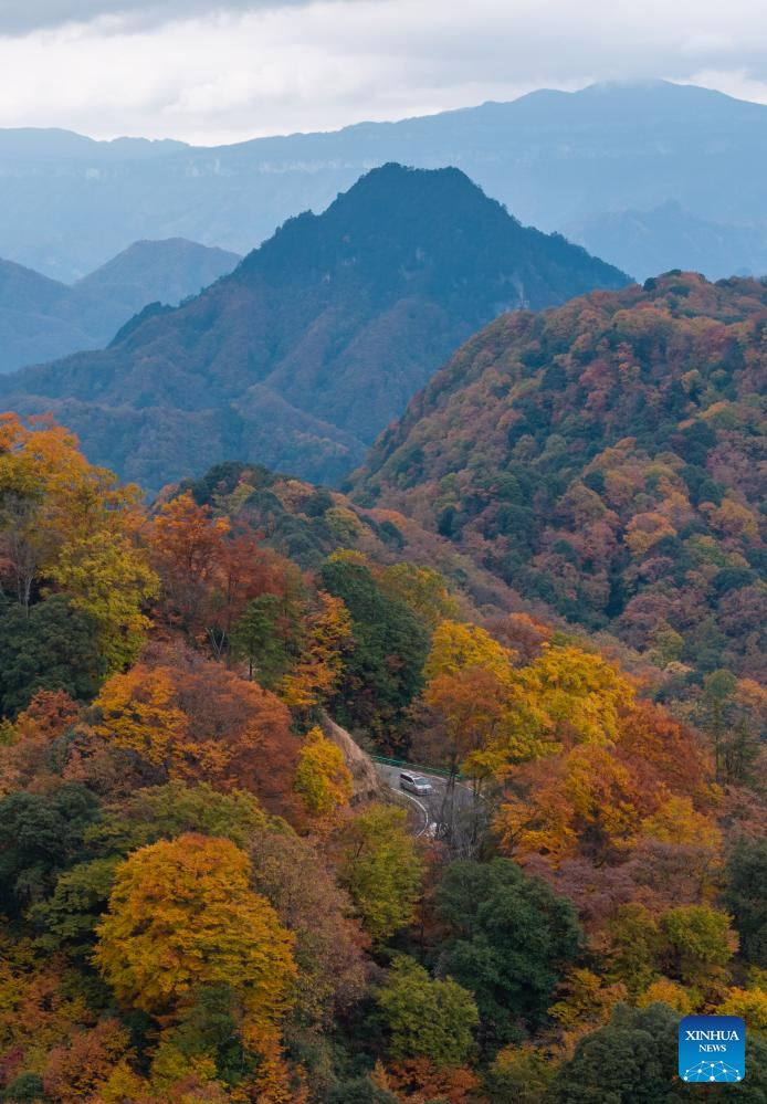 This photo taken on Nov. 6, 2024 shows a car running in Guangwu Mountain scenic area in Bazhong City, southwest China's Sichuan Province. (Xinhua/Jiang Hongjing)