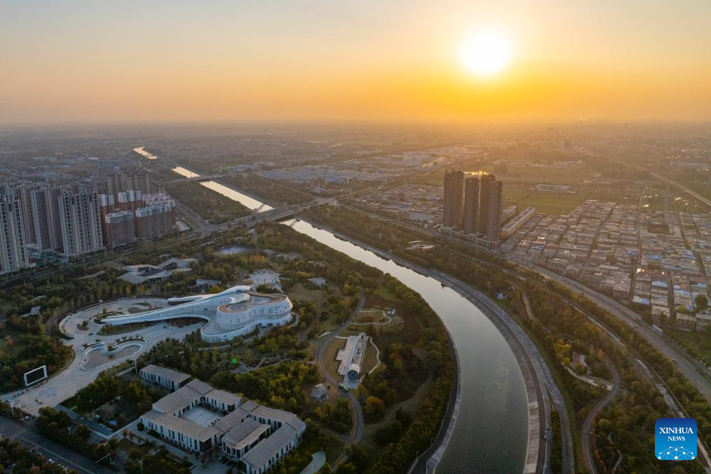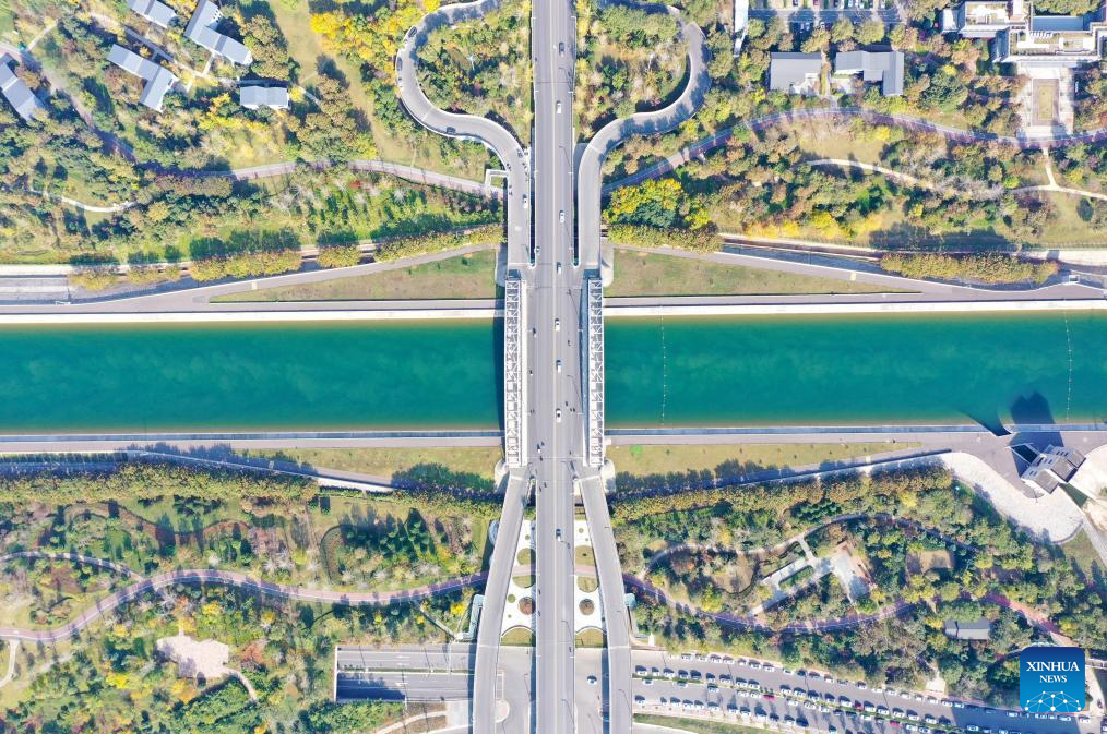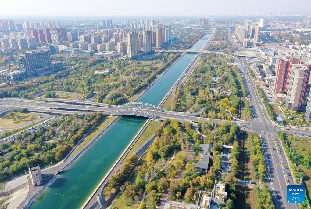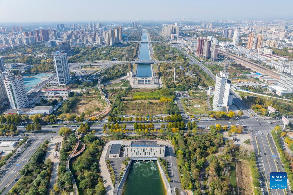 An aerial drone photo taken on Nov. 5, 2024 shows Tianhe Park along the main canal of China's South-to-North Water Diversion Project in Jiaozuo, central China's Henan Province. China's South-to-North Water Diversion Project has three routes. The middle route, which is the most prominent one, begins at the Danjiangkou Reservoir in central China's Hubei Province and runs through Henan and Hebei before reaching Beijing and Tianjin. It began supplying water in December 2014. (Xinhua/Hao Yuan)