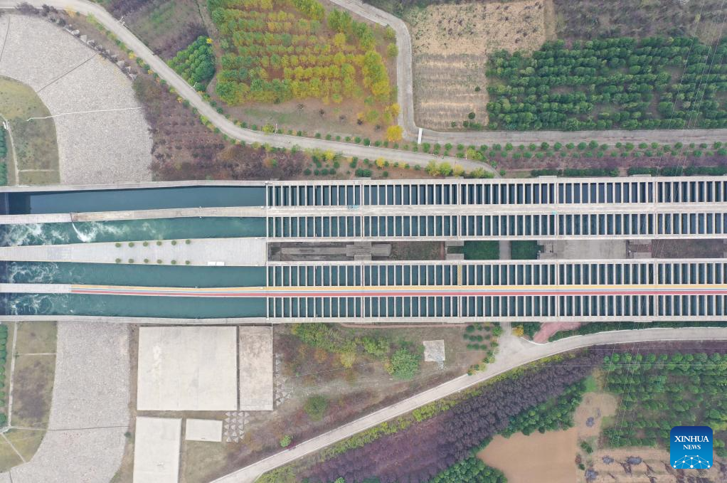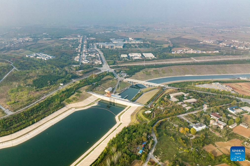 An aerial drone photo taken on Oct. 29, 2024 shows the Taocha Canal Head of the middle route of China's South-to-North Water Diversion Project in Xichuan County of Nanyang, central China's Henan Province. China's South-to-North Water Diversion Project has three routes. The middle route, which is the most prominent one, begins at the Danjiangkou Reservoir in central China's Hubei Province and runs through Henan and Hebei before reaching Beijing and Tianjin. It began supplying water in December 2014. (Xinhua/Wu Zhizun)