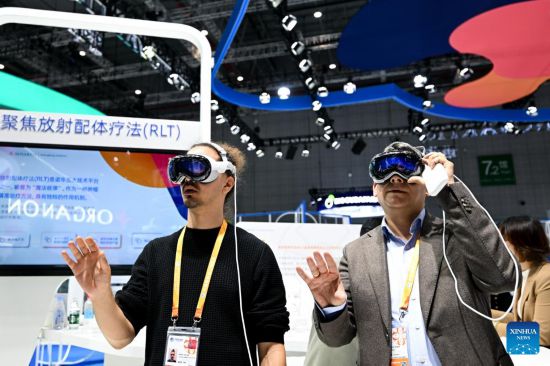 Visitors learn about medical treatment at the Medical Equipment &Healthcare Products Exhibition Area during the 7th China International Import Expo (CIIE) in east China's Shanghai, Nov. 8, 2024. With the theme of "Healthy China, Better Life," the Medical Equipment &Healthcare Products Exhibition Area during the 7th CIIE presented international leading medical innovation products and cutting-edge technologies and services. (Xinhua/Xin Yuewei)