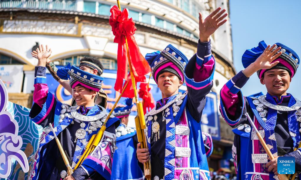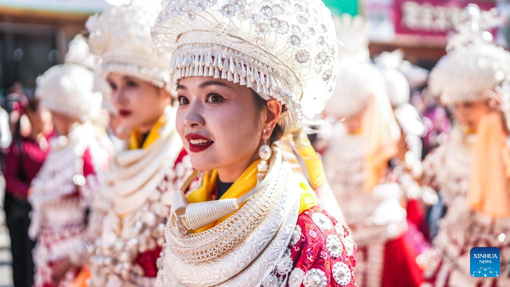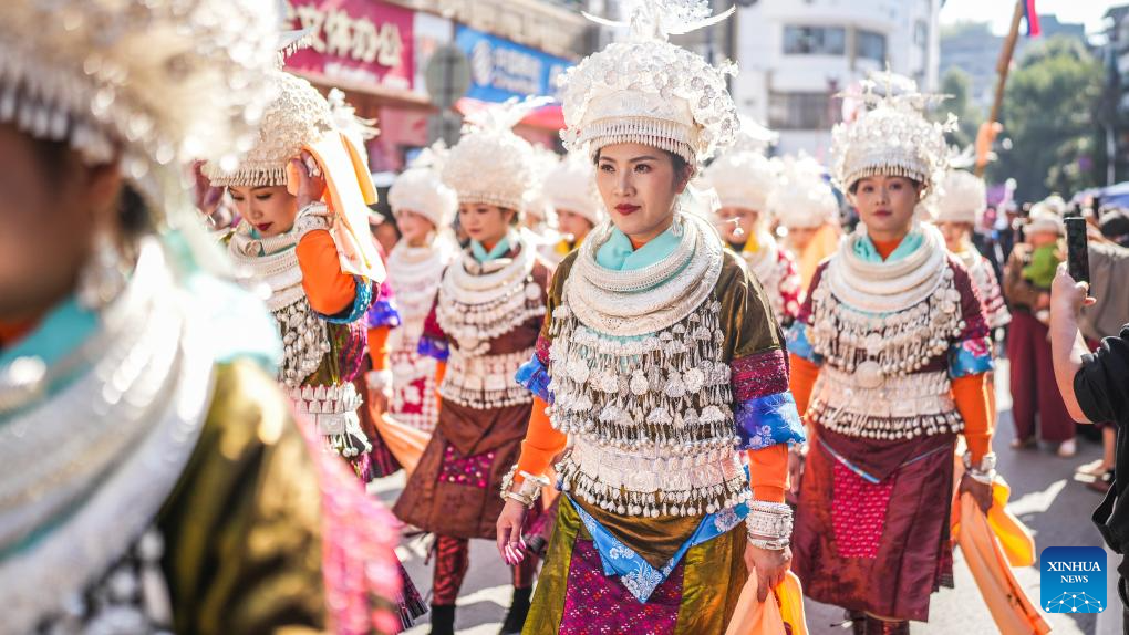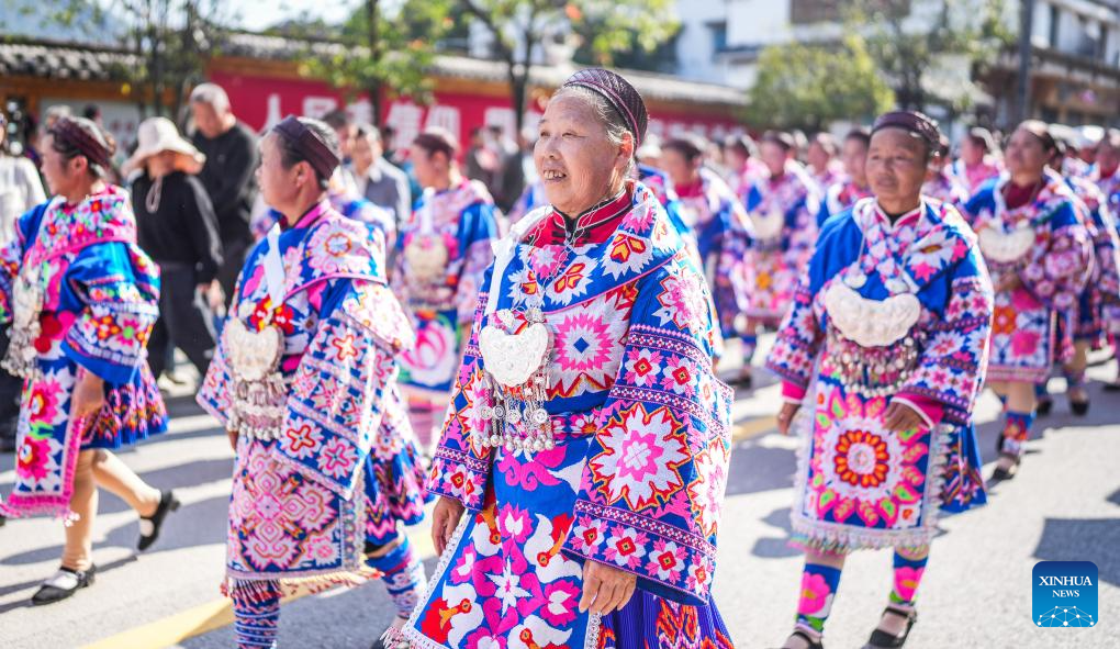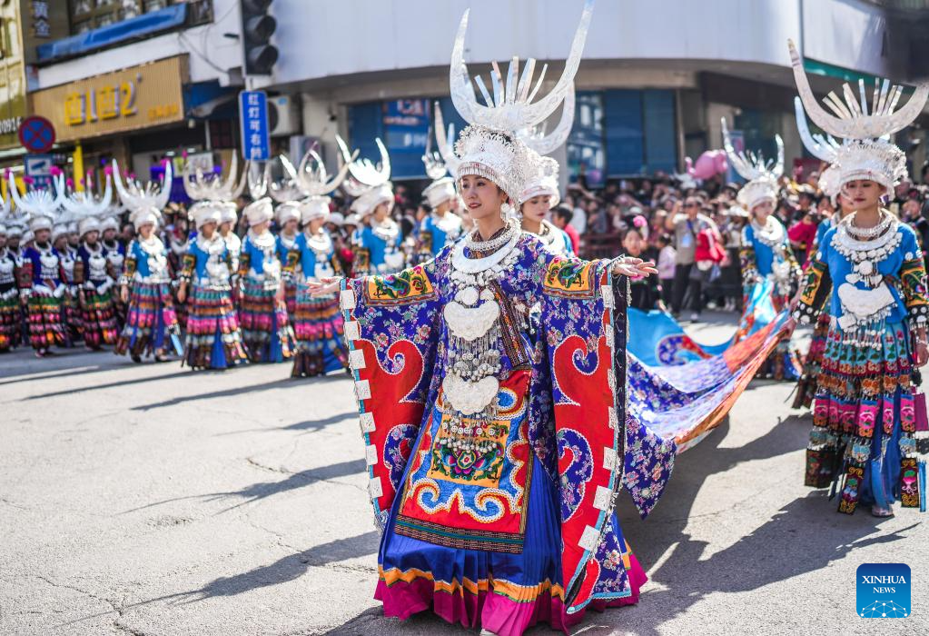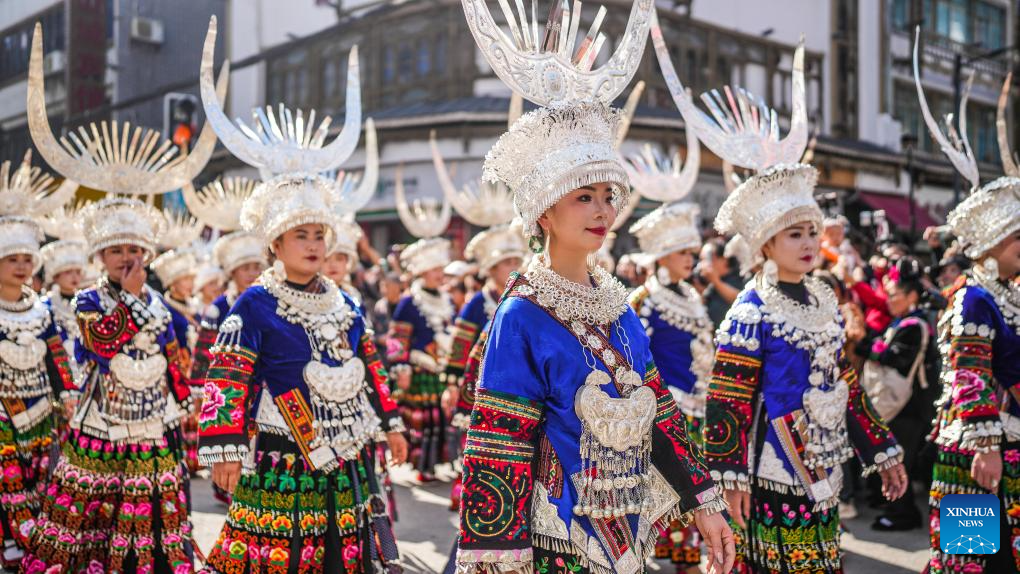 People of Miao ethnic group in traditional costumes take part in a parade to celebrate the Miao New Year at Leishan County of Qiandongnan Miao and Dong Autonomous Prefecture, southwest China's Guizhou Province, Nov. 10, 2024. Miao New Year is a major festival of people of Miao ethnic group. In 2008, the festival was listed as a national-level intangible cultural heritage. (Xinhua/Tao Liang)