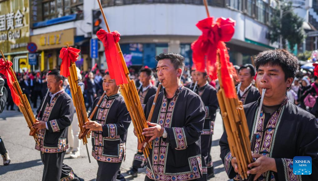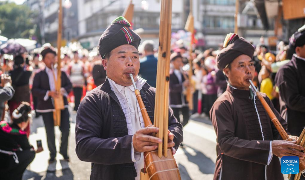 People of Miao ethnic group play lusheng, a traditional musical instrument, while taking part in a parade to celebrate the Miao New Year at Leishan County of Qiandongnan Miao and Dong Autonomous Prefecture, southwest China's Guizhou Province, Nov. 10, 2024. Miao New Year is a major festival of people of Miao ethnic group. In 2008, the festival was listed as a national-level intangible cultural heritage. (Xinhua/Tao Liang)