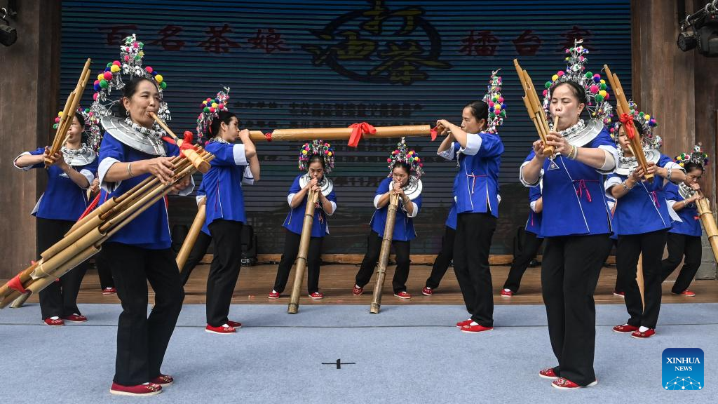 Women play traditional musical instruments at Yueye Dong Village, Sanjiang Dong Autonomous County, south China's Guangxi Zhuang Autonomous Region, Nov. 9, 2024. Various activities including dancing, oil tea feast, and folk art performances were held here on Saturday to celebrate the traditional Duoye festival, an occasion during which the Dong people used to gather around in a circle to chant their prayers. (Xinhua/Zhang Ailin)