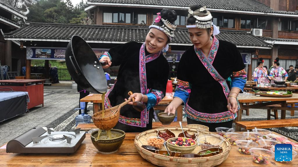 Women brew oil tea at Yueye Dong Village, Sanjiang Dong Autonomous County, south China's Guangxi Zhuang Autonomous Region, Nov. 9, 2024. Various activities including dancing, oil tea feast, and folk art performances were held here on Saturday to celebrate the traditional Duoye festival, an occasion during which the Dong people used to gather around in a circle to chant their prayers. (Xinhua/Zhang Ailin)