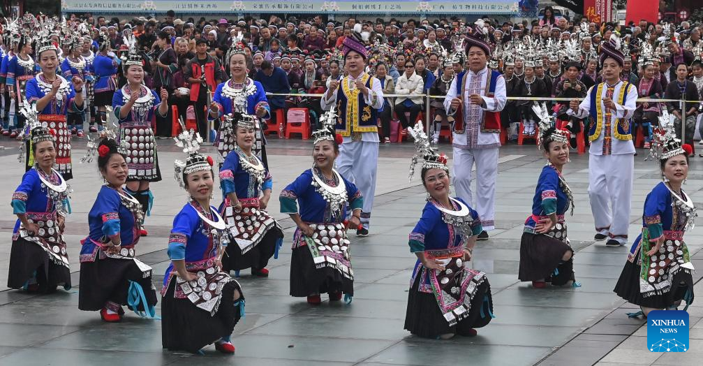 People attend a celebration of Duoye festival at Duoye Square in Sanjiang Dong Autonomous County, south China's Guangxi Zhuang Autonomous Region, Nov. 9, 2024. Various activities including dancing, oil tea feast, and folk art performances were held here on Saturday to celebrate the traditional Duoye festival, an occasion during which the Dong people used to gather around in a circle to chant their prayers. (Xinhua/Zhang Ailin)