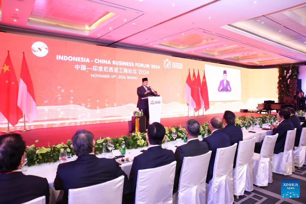 Indonesian President Prabowo Subianto addresses a China-Indonesia business forum in Beijing, capital of China, Nov. 10, 2024. (Xinhua/Pang Xinglei)