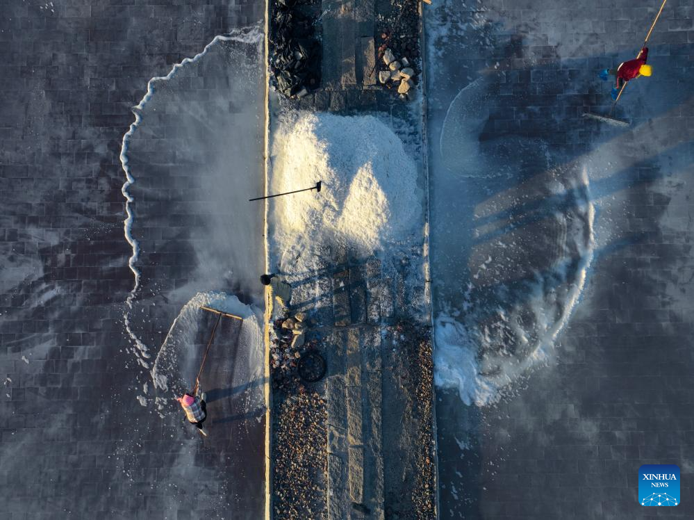 An aerial drone photo taken on Nov. 8, 2024 shows people working at Shanyao salt field in Quanzhou City, southeast China's Fujian Province. Covering an area of 920 hectares, the Shanyao salt field adheres to the traditional sun-drying techniques, and annually turns out 65,000 tonnes of sea salt. The Fujian traditional sun-drying techniques for sea salt production (Quanzhou style) was inscribed in the list of provincial intangible cultural heritage in 2022. (Xinhua/Jiang Kehong)