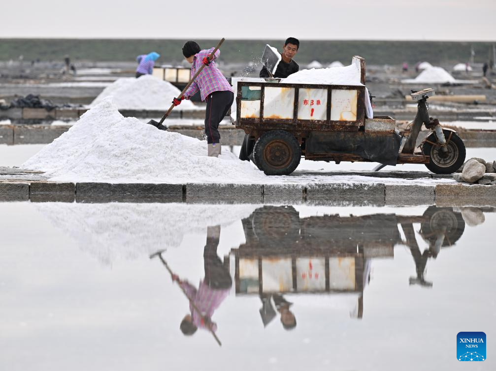 Workers transfer crude salt at Shanyao salt field in Quanzhou City, southeast China's Fujian Province, Nov. 9, 2024. Covering an area of 920 hectares, the Shanyao salt field adheres to the traditional sun-drying techniques, and annually turns out 65,000 tonnes of sea salt. The Fujian traditional sun-drying techniques for sea salt production (Quanzhou style) was inscribed in the list of provincial intangible cultural heritage in 2022. (Xinhua/Jiang Kehong)