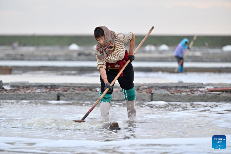 A worker operates at Shanyao salt field in Quanzhou City, southeast China's Fujian Province, Nov. 8, 2024. Covering an area of 920 hectares, the Shanyao salt field adheres to the traditional sun-drying techniques, and annually turns out 65,000 tonnes of sea salt. The Fujian traditional sun-drying techniques for sea salt production (Quanzhou style) was inscribed in the list of provincial intangible cultural heritage in 2022. (Xinhua/Jiang Kehong)