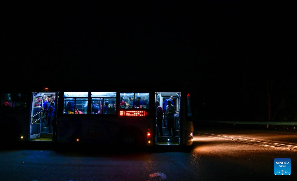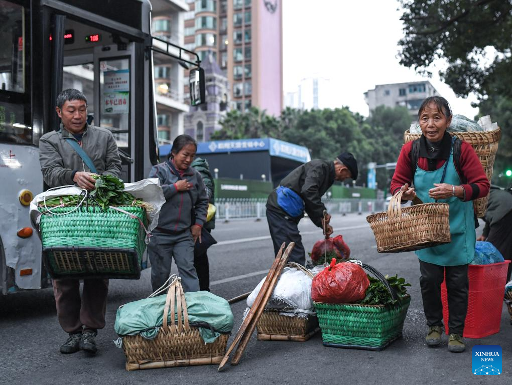 Farmers prepare to sell vegetables after getting off at the terminal station of Bus No. 252 in Yunyan District in Guiyang City, southwest China's Guizhou Province, Nov. 7, 2024. Bus No. 252, running between a rural area and urban district of Guiyang City, opened a special line in June this year to facilitate villagers along the line to sell their agricultural products.(Xinhua/Yang Wenbin)