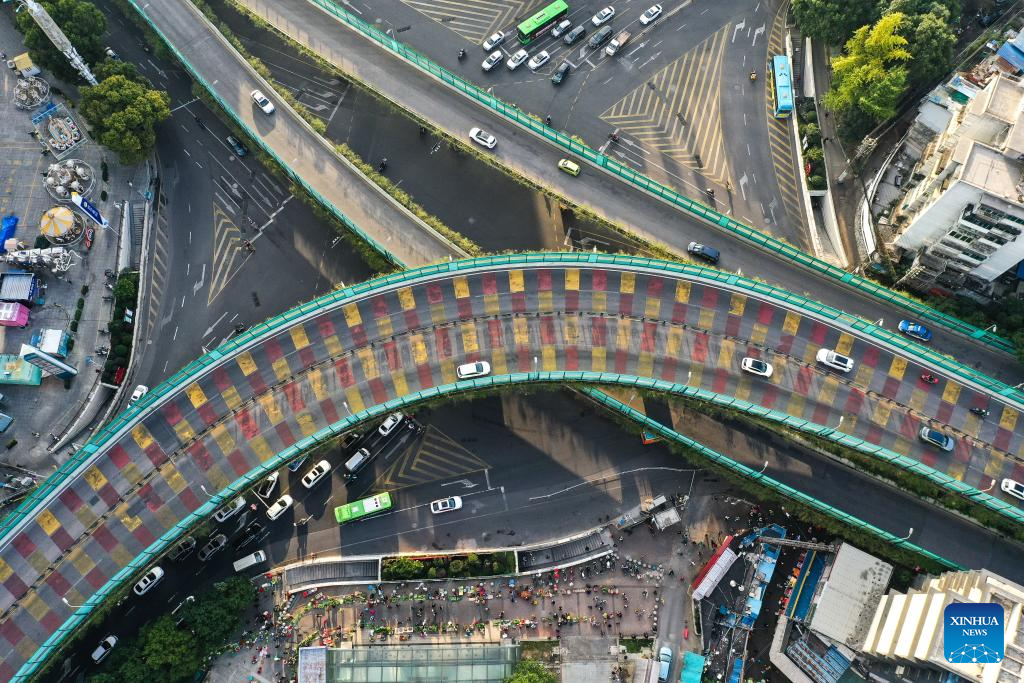 An aerial drone photo taken on Nov. 11, 2024 shows people shopping for fresh vegetables transported here by Bus No. 252 in Yunyan District of Guiyang City, southwest China's Guizhou Province. Bus No. 252, running between a rural area and urban district of Guiyang City, opened a special line in June this year to facilitate villagers along the line to sell their agricultural products. (Xinhua/Yang Wenbin)