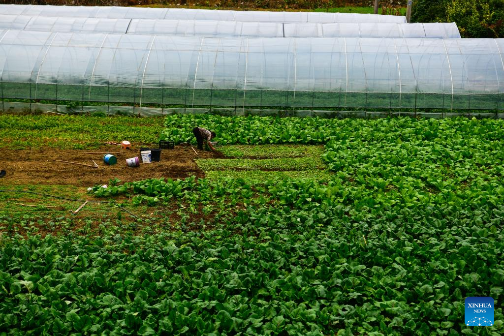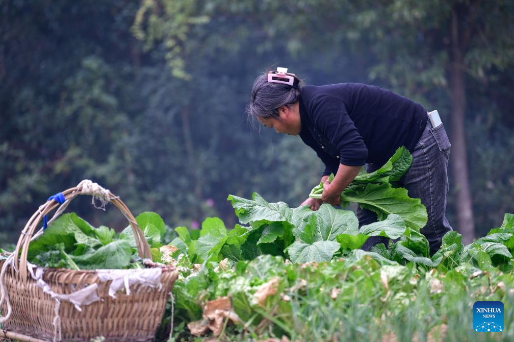 A farmer picks vegetable for sale in the city the next day in Xiaba Village of Wudang District, Guiyang City, southwest China's Guizhou Province, Nov. 6, 2024. Bus No. 252, running between a rural area and urban district of Guiyang City, opened a special line in June this year to facilitate villagers along the line to sell their agricultural products. (Xinhua/Yang Wenbin)