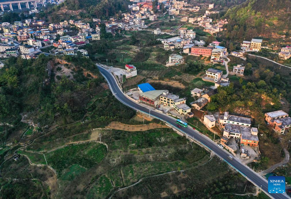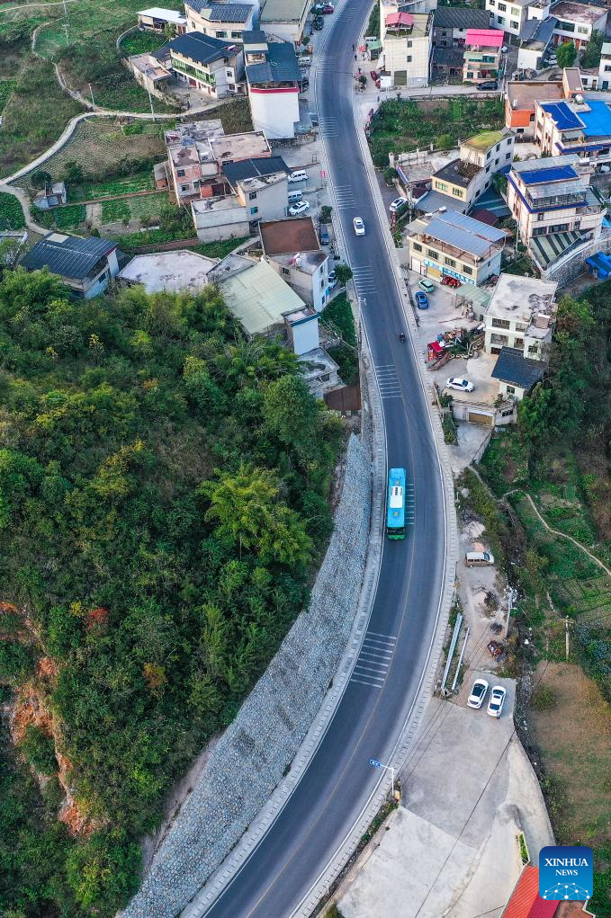 An aerial drone photo taken on Nov. 10, 2024 shows Bus No. 252 running in Shuitian Town of Wudang District, Guiyang City, southwest China's Guizhou Province. Bus No. 252, running between a rural area and urban district of Guiyang City, opened a special line in June this year to facilitate villagers along the line to sell their agricultural products. (Xinhua/Yang Wenbin)
