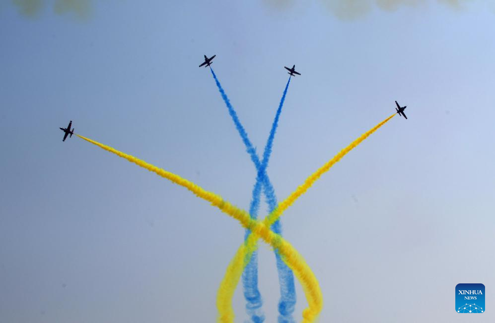 Aircraft of the Bayi Aerobatic Team of the Chinese People's Liberation Army Air Force stage a performance during Airshow China in Zhuhai, south China's Guangdong Province, Nov. 12, 2024. The 15th China International Aviation and Aerospace Exhibition, also known as Airshow China, kicked off in Zhuhai on Tuesday. (Xinhua/Lu Hanxin)