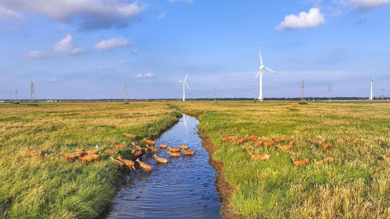 In Dafeng district, Yancheng, east China's Jiangsu province, milu deer and rotating wind turbines make a fascinating picture depicting the harmonious coexistence between man and nature. (People's Daily Online/Shi Jun)