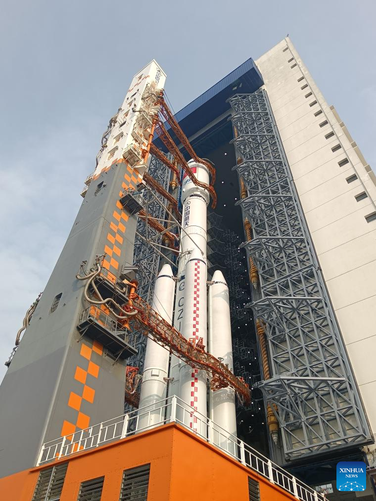This photo taken on Nov. 13, 2024 shows the combination of the Tianzhou-8 cargo spacecraft and a Long March-7 Y9 carrier rocket after being vertically transferred to the launch area. (Photo by Huang Guochang/Xinhua)