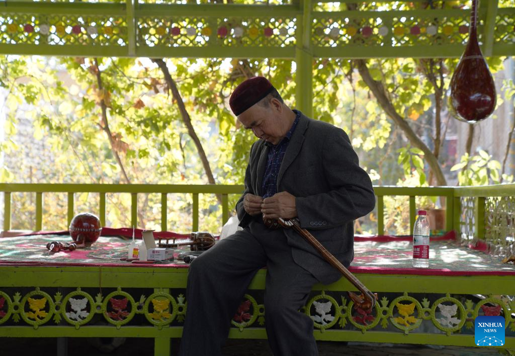 URUMQI, Nov. 13 (Xinhua) -- In a small courtyard dappled with light under a grape arbor, 65-year-old Nurdun Esmayil was making handmade folk musical instruments with his family and apprentices. Although he cannot read music, his keen ears have enabled him to make and play these instruments with precision.